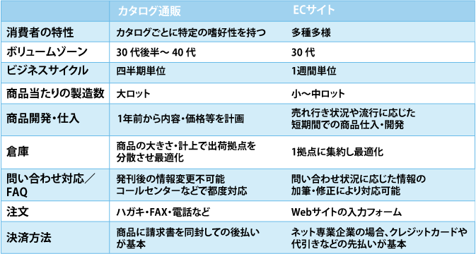 カタログ通販の場合、大量に注文が入ることを想定し、時間を掛けて選りすぐりの商品を大ロットで用意する。また、注文期間もカタログ掲載後半年など、一定期間に限られる。一方、ECサイトは週単位という短い周期で、小ロットの商品を回転させていくビジネスとなる。