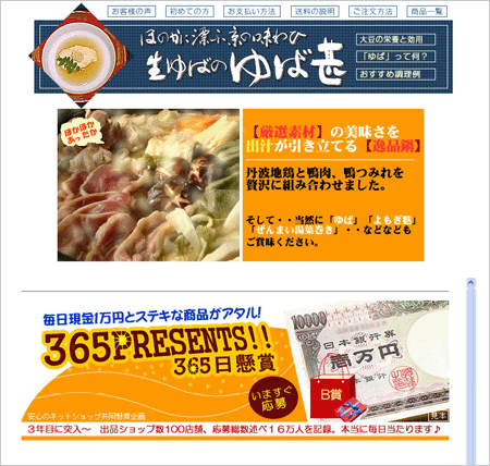 はい。楽天市場店では、1か月限定で定期的にプレゼントキャンペーンを行っています。プレゼントは現金1万円とプレゼント商品です。ちなみに、3月のプレゼントは「現金1万円と生ゆばとカニの婚約物語セットD」でした。現在はそれ以外にも、「毎日懸賞(プレゼント)」という共同企画に参加しています。プレゼントキャンペーンの主な目的は、メルマガの購読者集めです。応募されるのは、やはり新規のお客様の方が多いですね。