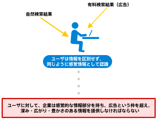 ブランディングとしての広告はさておき、「検索」において広告を広告として考えているのは、それを発信している企業だけである。検索結果画面において自然検索結果と有料検索結果を区別しているユーザがどれだけいるだろうか。ランディングページを広告の飛び先ページとして認識し、それによりアクションを使い分けているユーザはどれだけいるだろうか。広告を見る側は、本も雑誌も写真集もDVDも映画もテレビもインターネットもファッションもインテリアも同じように見るだろう。あらゆる情報は等しく人々に入っていく。つまり視覚空間・聴覚空間などの感覚空間の中で、広告もひとつの感覚情報として認識されるのだ。