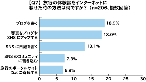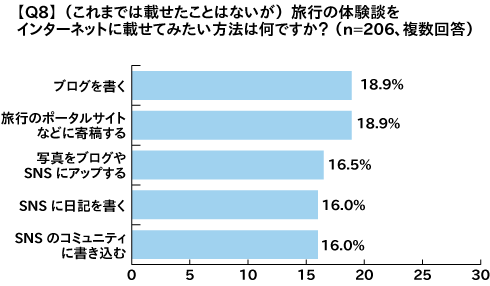 また、これまでに載せたことはないが今後載せてみたいと思う方法としては、「ブログを書く」と「旅行のポータルサイトなどに寄稿する」と答えた人がそれぞれ18.9%となり、「写真をブログやSNSにアップする」と答えた人も16.5%となった。