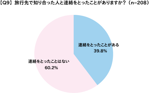 まず、旅先で知り合った人と旅行後に連絡をとったことがある人は82人、とったことのない人は124人となり、旅行後に連絡をとったことのある人は全体の39.8%(約4割)となった。