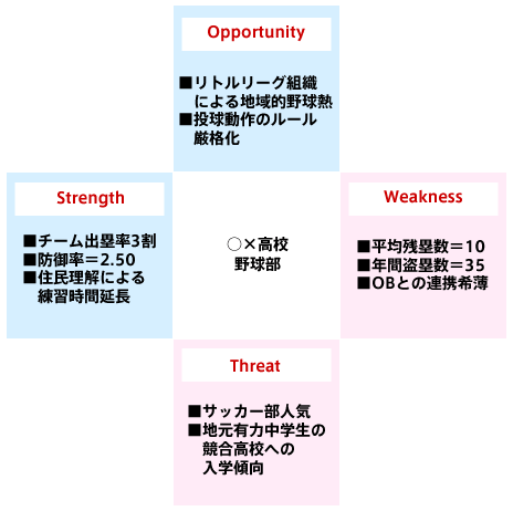 これらの過程で「地区大会の優勝を2年後までに実現する」とか「来シーズンはチーム盗塁数100を達成する」というような強化ポイントと連動したゴールが頭に思い浮かんでくるはずです。このゴールのイメージを大切に保存しておくことこそが、この分析のプロセスで大切なことであり、これから立案する戦略の礎になっていきます。