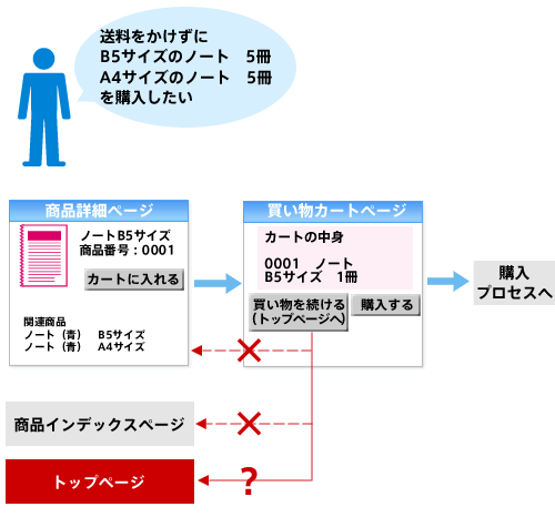 例えば、図の例のようにECサイトで買い物カートに商品を入れた後に、「買い物を続ける」ボタンをクリックするとトップページに戻ってしまい、サイズ違いや色違いの商品を選択するためには、もう一度はじめから同じプロセスを踏まなければならないなど、フローに関する問題が発生しているサイトは非常に多くあります。設計されたフローがユーザーの実際の行動フローと一致していないことによって起こる例のひとつです。