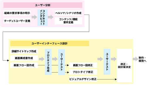 こうした問題点を見つけ出し、設計・構築プロセスの中で改善していくためには、システムやデザインに着手する前でも、パワーポイントやHTMLなどでフローと構成・ラベリングの確認を行うことができるレベルのプロトタイプを作成すれば、十分にユーザビリティの確認を行うことが可能です。