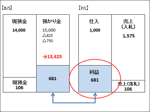 ユーザーBが10回入札  (預かり金)750円 (売上)750円