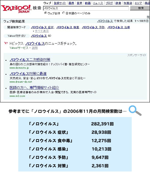これを応用すれば、「ノロウイルス」という突然需要が爆発したキーワード市場では、「ノロウイルス対策」「ノロウイルス予防」といったキーワードが最も重要であることがすぐにわかるはずだ。また、タイトルや説明文、ひいてはホームページ(ランディングページ)にも、「ノロウイルス予防には~」といったアクション言葉を意図的に強調することが、ユーザの反応を取る最も有効な手段というわけである。