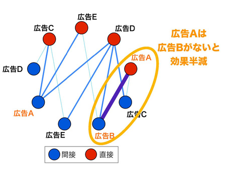 「広告Bは広告Aに非常に強くアシストし、広告Aは他に複数の広告へアシストもしています。さらに広告Bはアシスト先として有意なペアは存在しないことが分かると思います。広告Aは当社のブランド名のリスティング広告で、他からのアシストがあったり、他へのアシストでコンバージョンを稼いでいたりすることが分かりました。また、広告Bは当社の中で最近売上を伸ばしている商品名で、他からのアシストはありませんが単独でのコンバージョンもしくは広告Aへのアシストを行っていることが分かります」