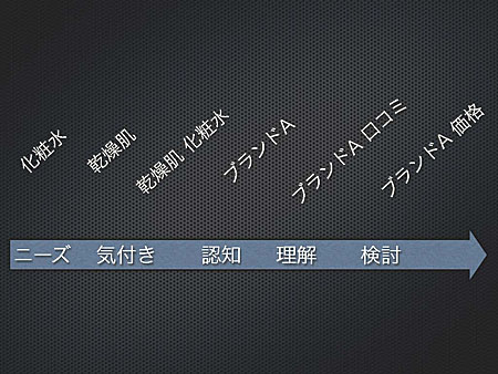 続いて、ある化粧品の例を取り、消費者がどのようなキーワードで検索を重ね、購入に至ったのか、その態度変容の例を示しながら、この段階のすべてが「アシスト」であると説明。間接効果の分析の本質がユーザー行動の分析であることを解説した。