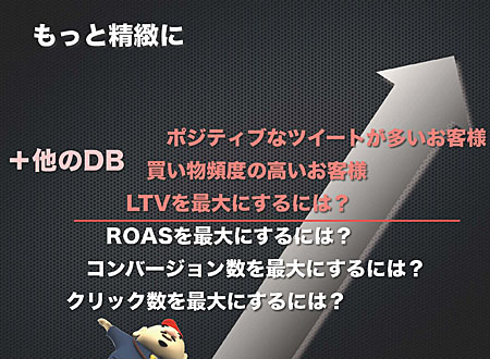 最後に、中川氏はある企業が打った3つの広告の例をとり、CPAだけに着目するのではなく、顧客が長期に渡って購入し続ける商品やサービスのトータル価値を測る指標である、LTV(Life Time Value/顧客生涯価値)に着目することの重要性を主張。今後は、売上データベース、顧客データベースなどとの連動が発展し、「買い物頻度の高いお客様」や「ポジティブなツイートが多いお客様」にアプローチすることのできるマーケティングプランも出現するだろうと予測し、講演を終了した。
