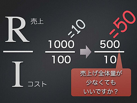「例えば、売り上げが1000でコストが100の場合のROIは10で、売り上げが500でコストが10だと、ROIは50。ROIだけで考えれば後者が50だから良い状態なのかといえば、そんなことはありません。売り上げの全体量が少ないという点を見落としてはいけません」として、「ROIは目的ではなく、課題発見のためのツールです」と結論付けた。