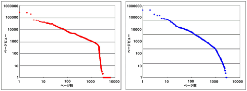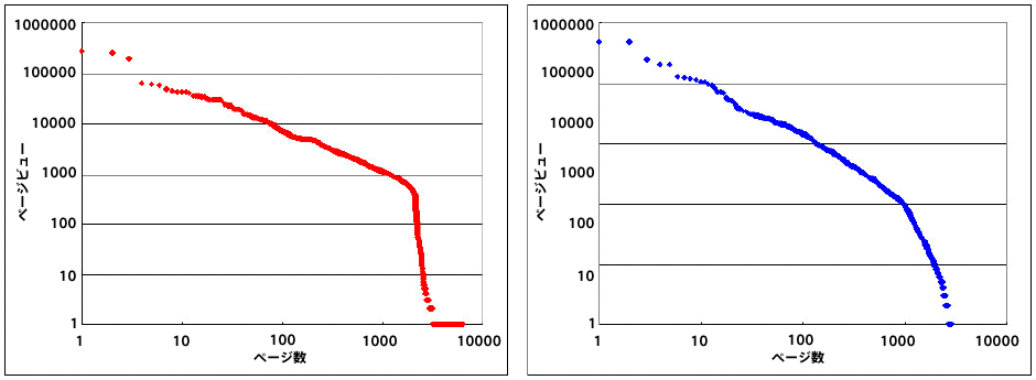次にページ単位でのページビューの分布を見てみましょう。グラフはやはり対数表示をしたものです。異なる2つのサイトのアクセスログデータを元に、縦軸にページビュー、横軸にページ数をおいた分布図になります。