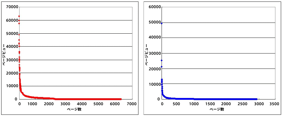 他にもいくつかのWebサイトのページ単位でのページビュー数についても調べてみましたが、やはり上の例と同様に、右下の部分が曲線を描きながら下降する傾向が見られました。これは1万ページを超えるような企業サイトでも、ページ数が100を超える程度のブログでも同様でした。