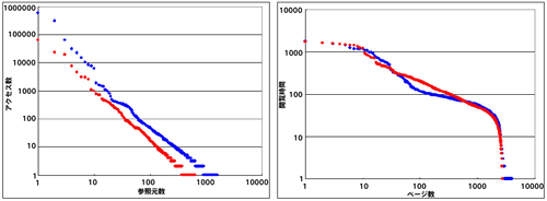 その他のアクセスデータに関しても同様に調べてみました。左は、どこのサイトからアクセスしてきたかを示す参照元のデータに関するグラフ、右は、ページごとの閲覧時間に関するグラフです。いずれもこれまで同様、両軸に対数をとった数値を用いています。