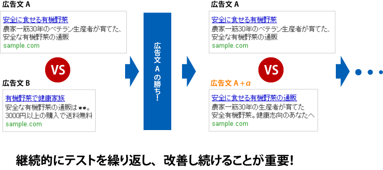 広告文のA/Bテストに終わりはありません。改善を繰り返し、常に最善の広告文を掲載することで、より的確に有効な見込み客を呼び込みことができるようになります。