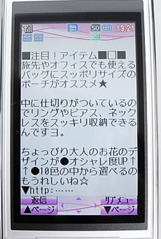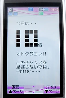 次に「目をひくポイント」です。下図のように、■や▼などを上手につかい目立つ構成を考えてみるのもよいと思います。モバイルユーザは、日頃絵文字や雛型を利用したデコレーションメールなどに慣れているため、ただ文章を連ねただけのメールよりもなじみが深くインパクトも強くなります。工夫次第でイラスト風に仕上げたりすることが可能です。