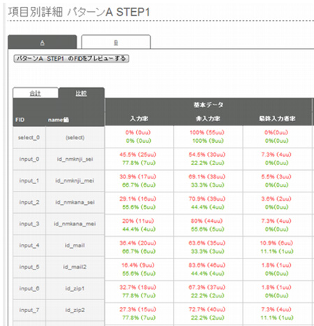 行が入力項目の1つ1つをあらわしており、列が指標になっています。赤い数値が離脱、緑の数値がコンバージョンした場合の数値となり、課題を見つけるために十分なデータが揃っていると言えるでしょう。