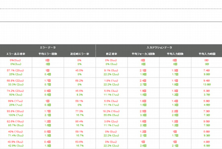 平均入力回数 | ユーザーが入力ボックスを選択しただけではなく入力した平均回数です。平均フォーカス回数との差分が、選択をしたけど入力をしていない率を表します。 | 低いほうが良い |