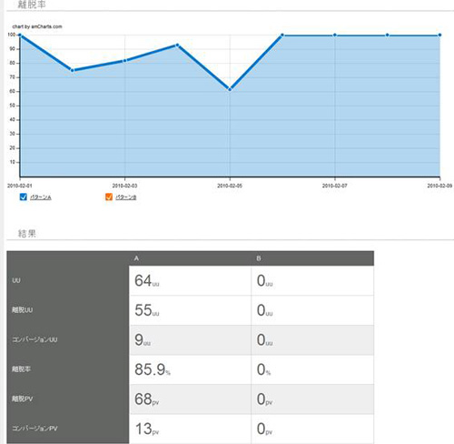 フォーム一覧の画面から「レポート」を選択すると、集計結果が閲覧できます。ここでは主に、フォームの離脱率・UU・離脱UU・コンバージョンUUなどの数値が確認できます。また有料プランで使えるA/Bテストを実施していると、それぞれのパターンの数値も比較可能です。