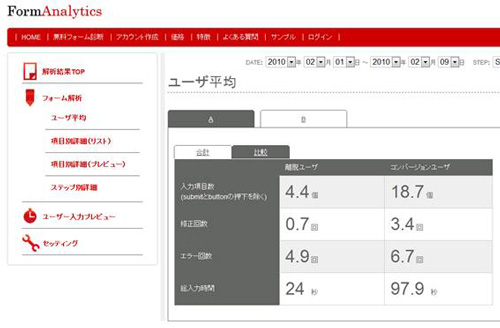 このレポートでは、全体・コンバージョンユーザー・非コンバージョンユーザーの「入力項目数・修正回数・エラー回数・総入力時間」。コンバージョンと非コンバージョンを比べてみると大きな違いが分かります。