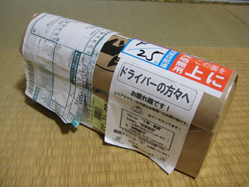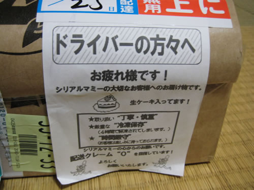そこで私は「ケーキが入ってます」というケーキの絵を入れたドライバーの方用の張り紙を作成しました。そして「伝票にバーコードがあって、その付近は必ず目を通す」というドライバーの方の言葉にヒントを得て、下写真にあるように、注意してもらえるように一文を伝票の上に紙を貼ったのです。