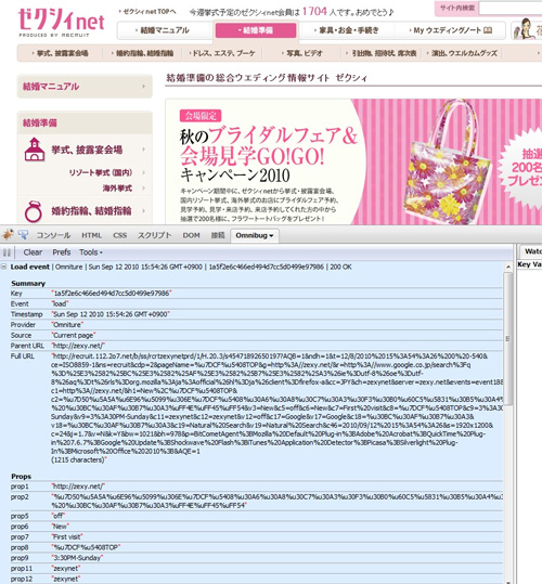 試しに、「ゼクシィ」を見てみましょう。「ゼクシィ」に導入されているSiteCatalystの計測データ。取得してURLや各種変数が確認できます。