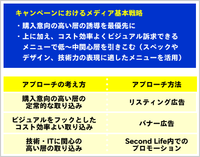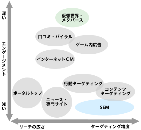 「どんどん新しい広告手法が生まれているインターネットの世界ですが、セカンドライフをはじめとする仮想世界が持つ広告メディアとしての一番の特性は、消費者とブランドとが『深い』絆(エンゲージメント)を築きやすい点にあると考えています。上の図にもあるように、今回のキャンペーンは、ターゲティング精度は高いけれどもエンゲージメントには弱いSEMと、深いエンゲージメントの構築が可能な仮想世界を両輪にして設計しています」(永松氏)