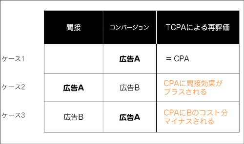 - ケース3:TCPAによる再評価を行った場合、間接に広告BがあることによってCPAに広告Bがコストとして計上されるため、その分がマイナスされます。