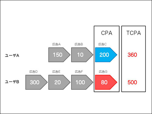 つまり、CPAで評価すると、ユーザーBのケースの方が効率よく見えますが、実際に掛かっているコストと利益をTCPAで計算すると、直前コストが高いユーザーAのケースの方が効率的ということがわかります。
