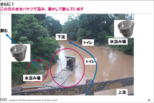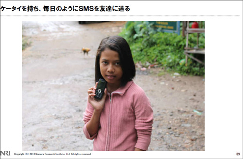 川の中に設置されたそのトイレのすぐそばに洗濯場があり、住人はこの水を汲んで沸かして飲んでいるという。しかし、この住人たちはパラボナアンテナを設置し、テレビを持ち、DVDを見て、少女は携帯電話片手にメールを送るのだ。小林氏はこうした現状を押さえたうえで、「パソコンよりも携帯電話の普及が鍵を握る」と見る。