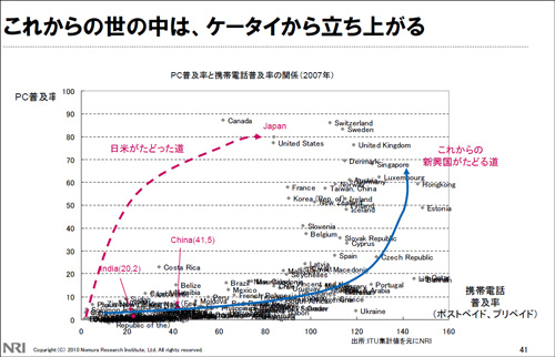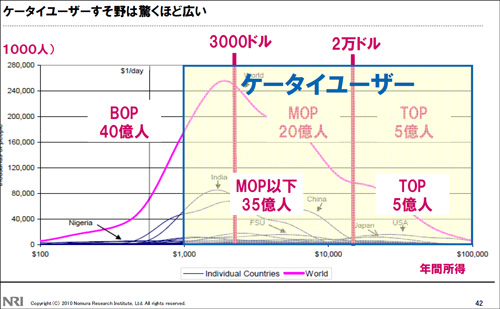 世界の携帯電話人口は40億人まで拡大してきており、携帯を通して全世界がつながり始めた。彼らとつながることで、リアルタイムの情報交換も実現する。ケータイユーザーの裾野は驚くほど広く、これからの世の中はケータイから立ち上がろうとしているのだ。