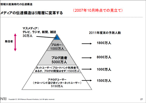 しかし、その後、SNSなどがスタートすることでブロガー1,000万人規模が出現。情報の伝達階層は5階層(マスメディア30万人/ブロガー1,000万人/ブログ読者5,000万人/ネットユーザー1,500万人/アナログユーザー5,150万人)と拡大した。