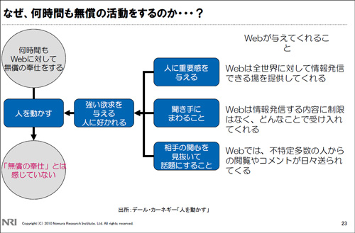 「自分を中心とする輪をもっと大きくしたい」「誰かとつながっているこの線をもっと深くできないか」と欲望がわいてくるという。こうしたものをソーシャルメディアが提供できれば、人はそこに動き出す。