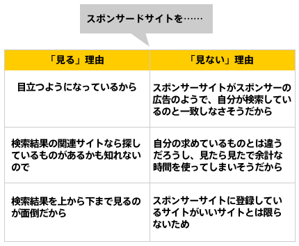 逆に「見ない」と答えたユーザーに対しては、「スポンサーサイトがスポンサーの広告のようで、自分が検索しているのと一致しなさそうだから」、「たいがい自分の求めているものとは違うだろうし、見たら見たで余計な時間を使ってしまいそうだから」、「スポンサーサイトに登録しているサイトがいいサイトとは限らないため」、「営利優先の宣伝が多く、期待した検索結果と違うことが多いから」、「検索した内容とは関係ない感じがする」といった回答が多く見受けられた。