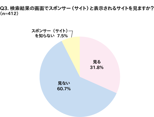 Q3からQ5では、検索結果画面で「スポンサーサイト」と表示される部分について尋ねた。スポンサーサイトを「見る」と答えたユーザーは31%、「見ない」と答えたユーザーは60%、「スポンサーサイトを知らない」と答えたユーザーは7.5%となった。