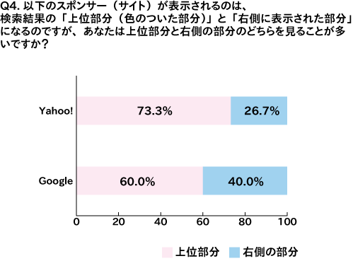 「上位部分」と答えたユーザーは Yahoo!で73.3%、Googleで60%となった。Yahoo!において「上位部分」は「右部分」よりも約3倍高い結果となったおり、多くのユーザーは検索結果を「上から」見ていく傾向にある事がわかった。