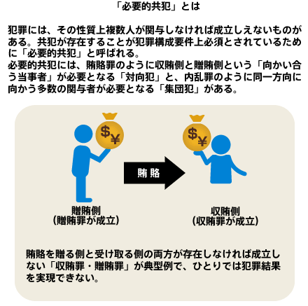 犯罪には、その性質上複数人が関与しなければ成立しえないものもあります。賄賂を贈る側と受け取る側の両方が存在しなければ成立しない収賄罪・贈賄罪が典型例です。このような犯罪類型を「必要的共犯」のうち「対向犯」といいます。対向犯でありながら一方のみを処罰し、他方については処罰を規定していない場合は、他方については「立法者がその処罰をしない意思をあらわしている」と理解され、従犯(刑法62条)として処罰されることもありません。
