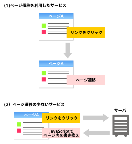 それを見ることで、そうしたものにどう対応すればいいのかがわかってきます。ページ遷移がなくても、そのページの中身はユーザーの操作や情報の変化によって書き換わっているわけですから、サーバとのやり取りは発生しています。しかし、通常のページ遷移が「ページを切り替える」という作業によってサーバとのやり取りを行うのに対し、こうしたサービスでは、JavaScriptなどを利用して、ページを移動することなく、サーバとのやり取りを行っているのです。