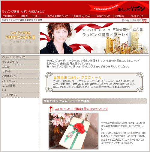 このコーナーは、サイトオープンの時から毎月かかさずに更新しています。五味栄里さんは、伊勢丹、松坂屋、丸井、サティ、エステーローダー、ユニーなどをはじめとして、全国の主要百貨店、量販店、企業の講師として長年ラッピングの指導にあたっている方で、雑誌やテレビなどでも活躍されてます。