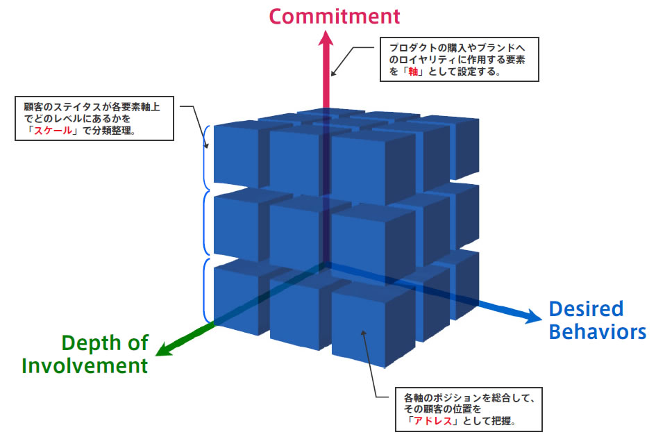 これらの軸上で、顧客が抱く行動面や感情面を数値化する概念だと思えばいいでしょう。その概念を図示すると下のようになります。