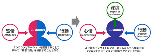 LFWの顧客セグメンテーションの基本は、「ロイヤリティ・コンビネーション」と呼ばれる手法です。実は、以前からロイヤリティを基軸とした顧客層の捕捉手法はありました。ただしそれは感情(Attitudes)×行動(Behaviors)の2軸による平面的な視点でしかなかったのです。