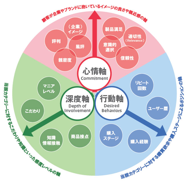 - 深度:当該カテゴリーに対するこだわりや知識などの感度・情報レベル。個々の判断基準や購入条件と密接に関係する