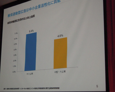 また『検索連動型広告の売上向上効果』のデータを示し、AdWordsのような検索連動型広告は、中堅・大企業よりも中小企業の方が相性がよいと解説。「AdWordsは、販売先の拡大と収益改善に貢献し、売上向上にもつながります」(清水氏)と語った。
