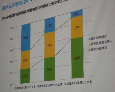 Googleオープンビジネスパートナーの具体的な詳細を紹介する前に、清水氏は2003年から2008年の中小企業の販売先増減と収益性変化の関係性について紹介。データによると、販売先が増加している中小企業の59%は収益性を大きく改善している傾向にあり、逆に販売先が減少している中小企業の46%は収益性が大きく悪化している傾向にあるという。