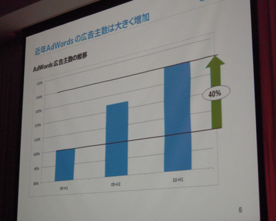 一方、2009年前半と2010年前半を比べると、AdWordsの利用者は40%増となるが、中小企業単位で見ると、まだまだ利用が進んでいないと紹介。国内の中小企業全体で見ると、PCで検索連動型広告を使用している企業は12%しかなく、アメリカ、イギリス、ヨーロッパと比べると低い状況だ。