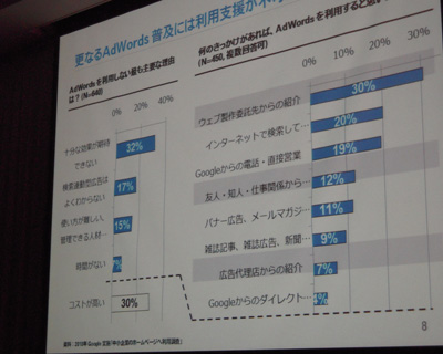 グーグルが行ったアンケート調査によると、AdWordsを利用しない主要な理由は、効果がわからない、運用の不安があるといった内容。逆に、金銭的な理由は30%ほどしかない。また、どのようなきっかけがあれば、AdWordsを利用するかという質問に対して、30%の人がウェブ制作委託先からの紹介を選んでおり、AdWordsに興味はあるがそのきっかけがなく第3者のサポートを欲しているという、ニーズが見え隠れしている。