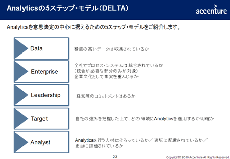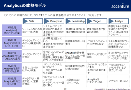 以上、DELTAモデルの5つのステップを軸に企業を見てみると、Analyticsの成熟度を5段階に分けられるという。5つの軸で企業を5段階に評価した分析表は次の通り。