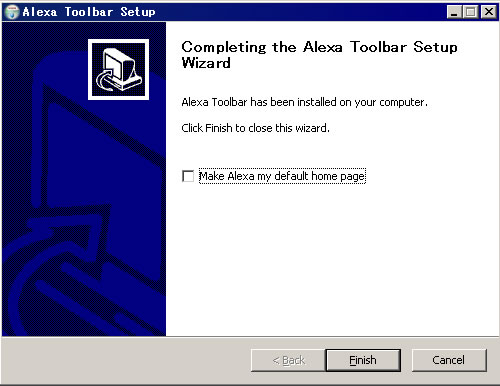 インストーラの最後では、Alexaのサイトをブラウザのホームページにするか訊かれます。ブラウザのホームページに指定して便利なウェブサイトは他にたくさんありますし、Alexaをホームページにすることはありえないでしょうから、このチェックはつけないほうがいいでしょう。