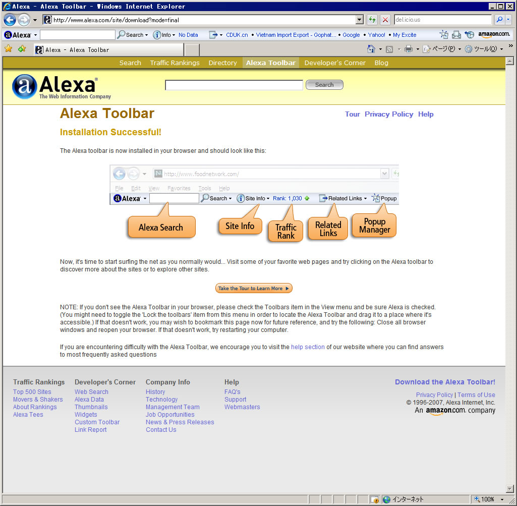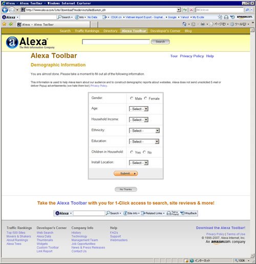 "Finish"で終了すると、Internet Explorerが再起動し(他の画面も開いている場合は、再起動してよいか確認がされます)、IEの上部のツールバーに、一列分のAlexa Toolbarが表示されます。また、インストール直後は、利用者アンケートのページに飛ぶようになっています。ここで性別・年齢・年収・人種・最終学歴・子供の有無・ツールバーをインストールした場所、などを回答すると、Alexaの統計データに反映されるかもしれません(実際にこれらを元に分類した統計は、今のところAlexaでは提供されていませんが)。