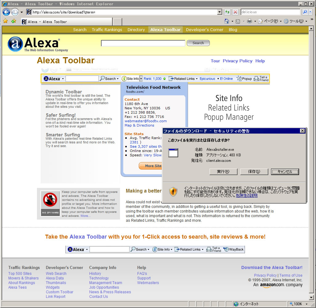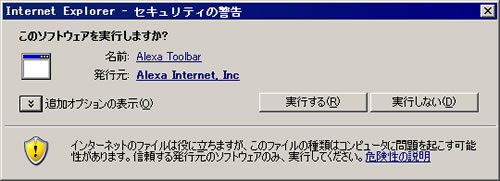 もしここで"Browser Version Not Supported"のページが表示された場合は、お使いのブラウザで使えるAlexa Toolbarは無いということになります。ダウンロードが終了したら、ダウンロードされたファイル AlexaInstaller.exe を実行してください。Windowsのバージョンやセキュリティ関連の設定によって、外部のプログラムをインストールすることについての確認の警告ウィンドウがでるかもしれません。