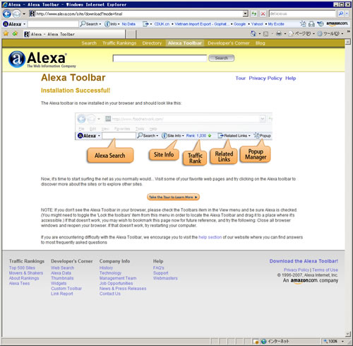 Alexaの配布している公式なツールが、Windowsで動くInternet Explorer用のAlexaツールバーです。今回は、このツールバーのインストール手順を追って解説します。連載の前回から、またしてもトップページのデザインが変わってしまいました。